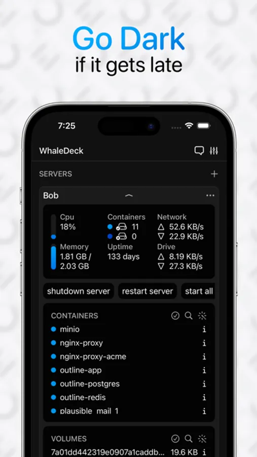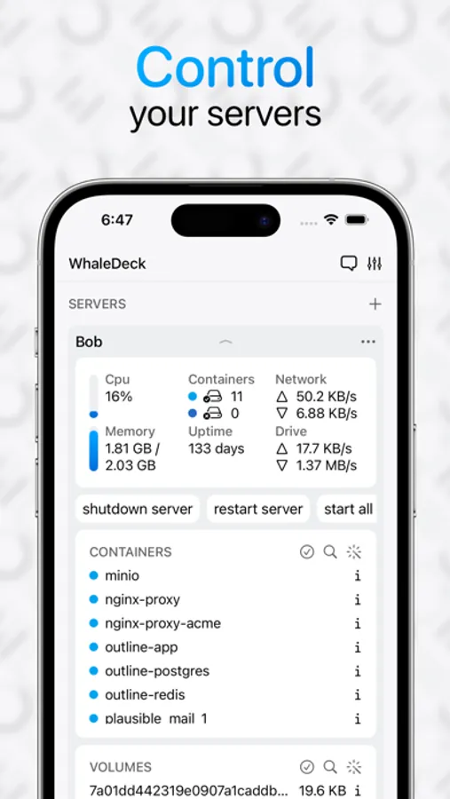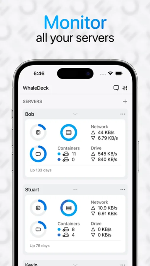 Monitor your containers with ease, thanks to WhaleDeck's real-time visualization of CPU, memory, drive and network usage. Keep track of your container logs and quickly identify issues with the built-in log viewer. And with support for multiple servers at once, you can easily manage all of your Docker environments from one place.