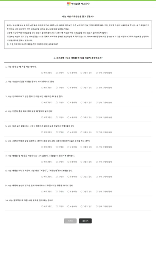 ○ 이 진단도구는 학생들의 언어습관 실태를 진단하기 위해 특정 시기에 활용할 수 있고, 언어습관의 개선 정도를 알아보기 위해 일정 기간 동안 반복적으로 활용할 수 있습니다.