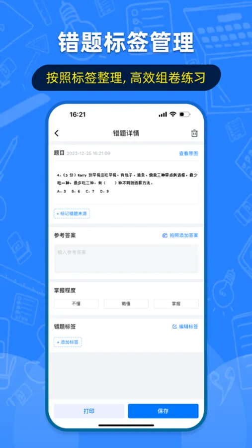 错题整理:自动框选错题,一键去除手写,自由选择错题组卷打印,错题针对性练习