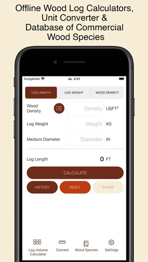 - Log Length Calculation based on wood density, log weight and mid-diameter or circumference