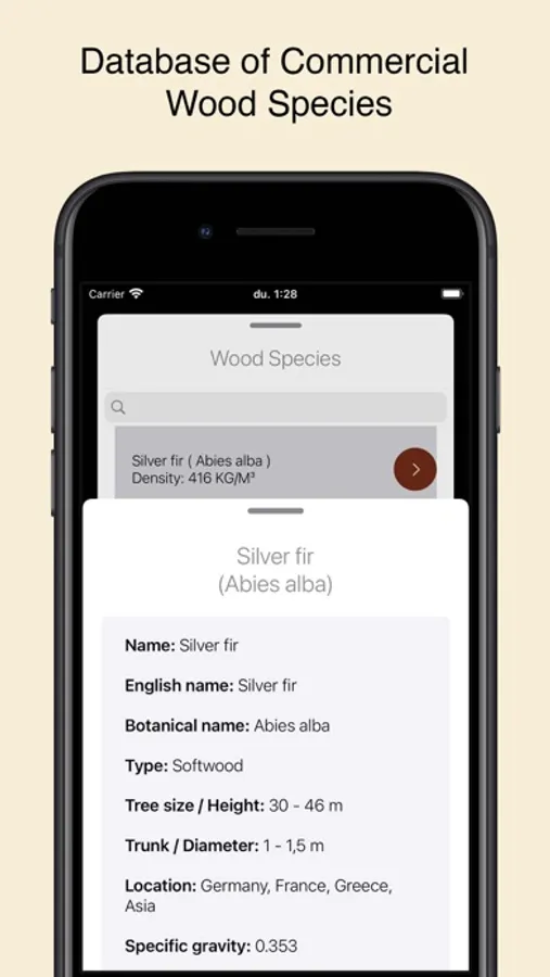 - Commercial wood species database ( density, specific gravity, hardness, shrinkage, ... ). This database contains the means density. The density of wood differs depending on tree species and tree growth environment. For most species the literature thus gives a range with low, medium and high values.