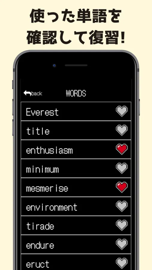 ゲームに使用した単語は終了後にお気に入り登録することで単語帳に保存!