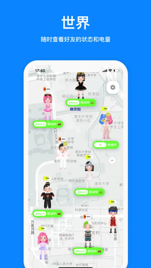 *实时查看好友的位置和电量!无论他在家还是在学校,查看他们的出行速度或者是在咖啡厅停留了多长时间,当然如果你现在想要隐身,也可以设置隐身模式停止共享位置~还可以了解他的手机电量是否快要耗尽,还是正在为和你的见面充电!