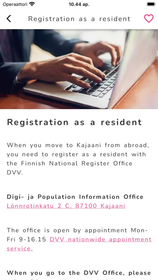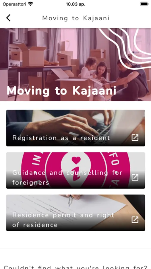 The City of Kajaani International info service application helps immigrants to find information independently about various practical issues related to living in Finland and Kainuu. The app guides the customer through different service paths such as health, work, housing, mobility, school, family or leisure services. The service paths help the customer to find the practical information they are looking for, for example, which health services you belong to, how to book time for these services, how to read the local bus timetable, what kind of hobbies are available in the area. Through the app, the customer can directly contact Kajaani International Services if the information they are looking for cannot be found in the app or if they have specific questions.