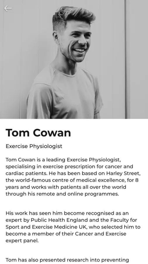 With the Tom Cowan Exercise Physiology App, you can receive a completely bespoke exercise programme tailored specifically to your clinical history, medical diagnosis, treatment plan, medications and side effects, fitness levels and the objectives that you and your medical team wish to achieve. Tom prescribes exercise programmes which are underpinned by an evidence-based approach, following Sport and Exercise Science principles, the latest research and, for clinical patients, guidance from clinical bodies such as BACPR.