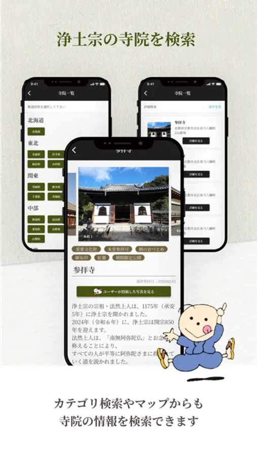 浄土宗寺院を都道府県やカテゴリで検索することができます。(登録寺院は随時更新・追加されます)また寺院詳細では住所や参拝可能日などの基本的な情報はもちろん、寺院の歴史やお写真、詳しい情報を確認することができます。