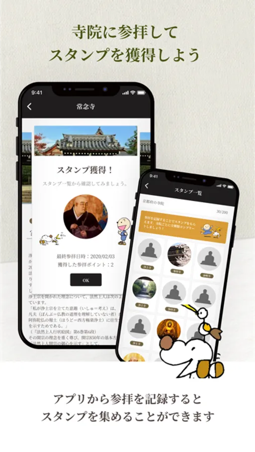 GPS情報を読み取り、参拝したことを記録することができます。参拝の記録をすることで各寺院のスタンプを集めることができます。スタンプの種類は各寺院ごとに最大3種類です。全てコンプリートを目指しましょう。
