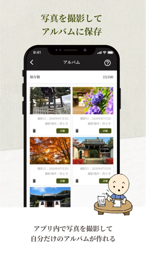 本アプリケーションから寺院をカメラ撮影することができます。写真と寺院名、メモをセットにしてアプリ内のアルバムに最大100枚まで保存することができるので、寺院巡りの思い出帳としてお使いください。