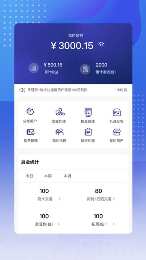 6、我的代理:查看我推广的代理业绩及机具情况;