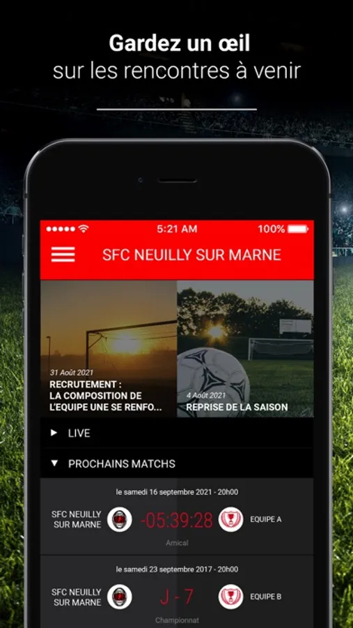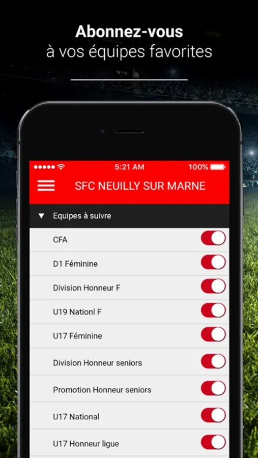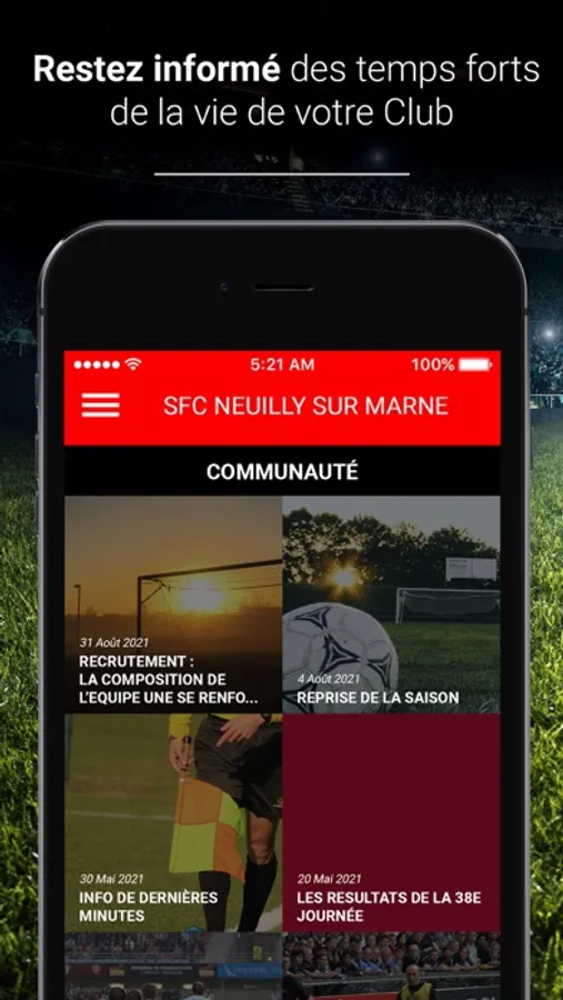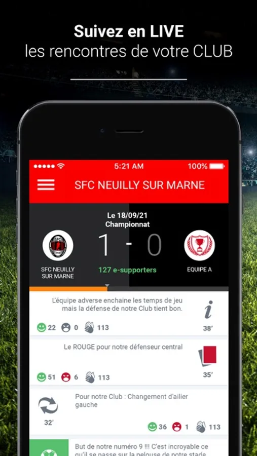 L’application SFC NEUILLY SUR MARNE vous permet de suivre toute l’actualité de votre Club favori. Vous pourrez vous abonner à vos teams préférées (équipe 1, cadet, U18, féminine,…) et suivre en direct chaque rencontre sportive faisant l’objet d’un Live. A vous de soutenir votre Club : l’application vous permet d’interagir avec l’équipe pour l’encourager ou pour siffler des séquences de jeu.