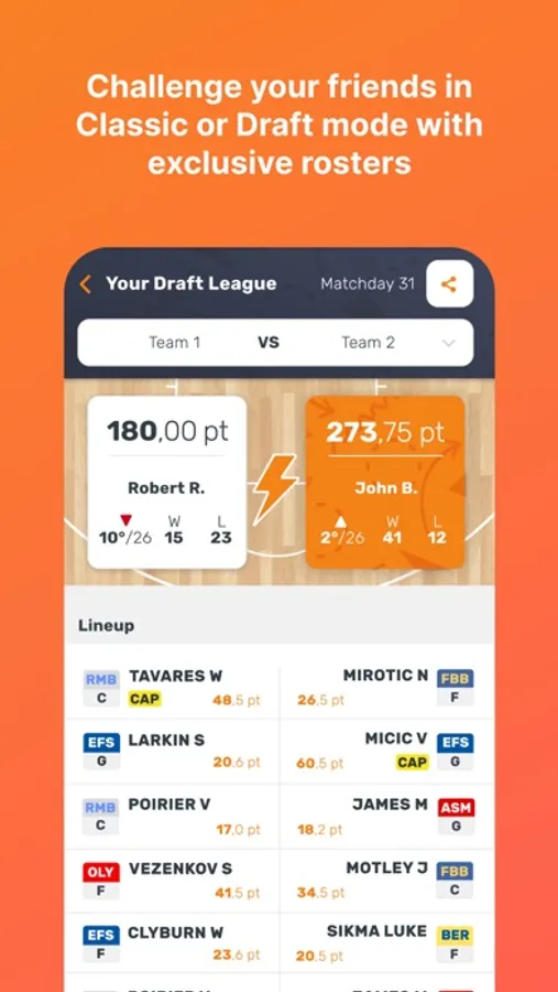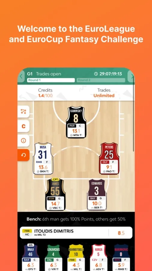 1) Classic mode (all versus all): you have 100 credits to choose 10 players and 1 head coach and challenge other users. Fantasy teams have non-exclusive rosters, meaning that each EuroLeague player can belong to multiple fantasy coaches.