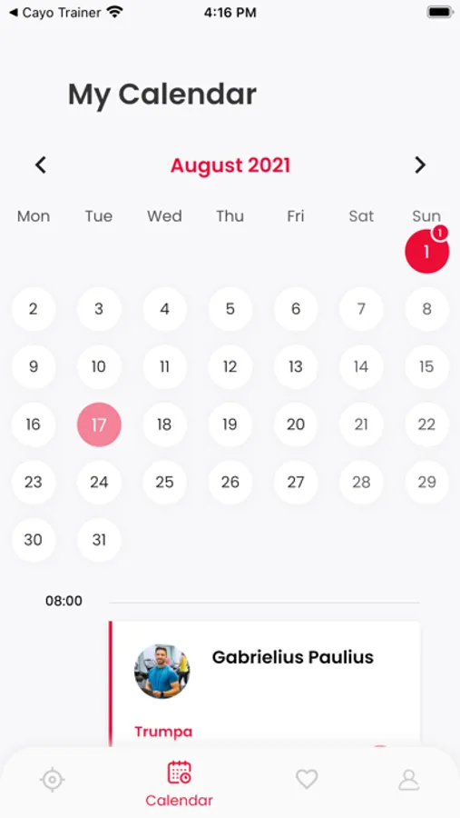 Kiekvienas programėlės vartotojas turi savo kalendorių, kuriame mato savo jau atliktas rezervacijas ir būsimų treniruočių grafiką.