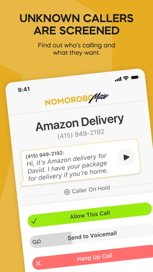 Just like one of those expensive call answering services, Nomorobo Max screens the caller to find out who they are and what they want. Then you decide - answer it, send it to voicemail, or hang up.