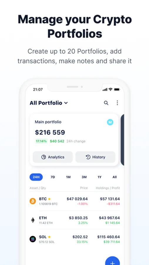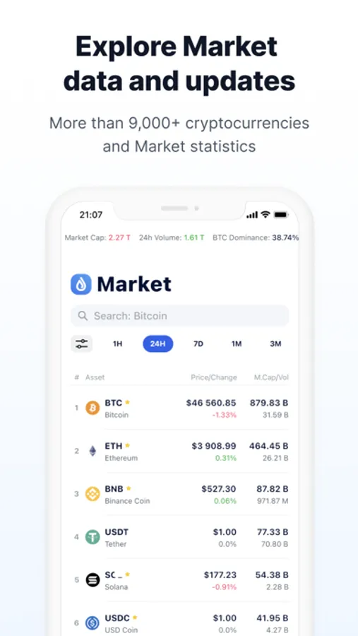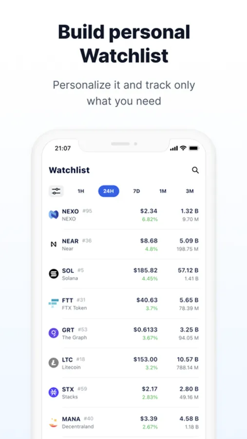 -Track and follow any coin, including the most popular ones such as Bitcoin, Ethereum, Solana, Polkadot or FLOW. We`ve listed +9,000 coins;