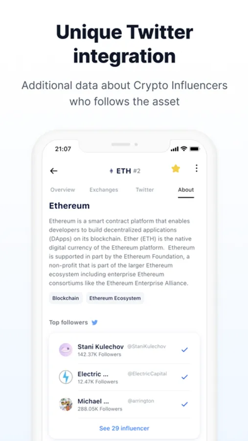 Whilst on the coin`s page you can see LIVE price of your selected coin with charts that can be altered by selecting other currency pairs. We`ve introduced the performance section to help you evaluate your coin`s score against other coins, blockchains and indexes in a much faster and seamless way. You can also see which exchanges support your token, showing current trading performance and volumes. You can always chose between CEX, DEX, or Spot for your convenience. Browse through the news feed and updates of the project from the "Twitter" tab. The "About" section will provide you some brief information and list the top influencers subscribed to your chosen coin. This way you see the full picture and performance of a cryptocurrency.