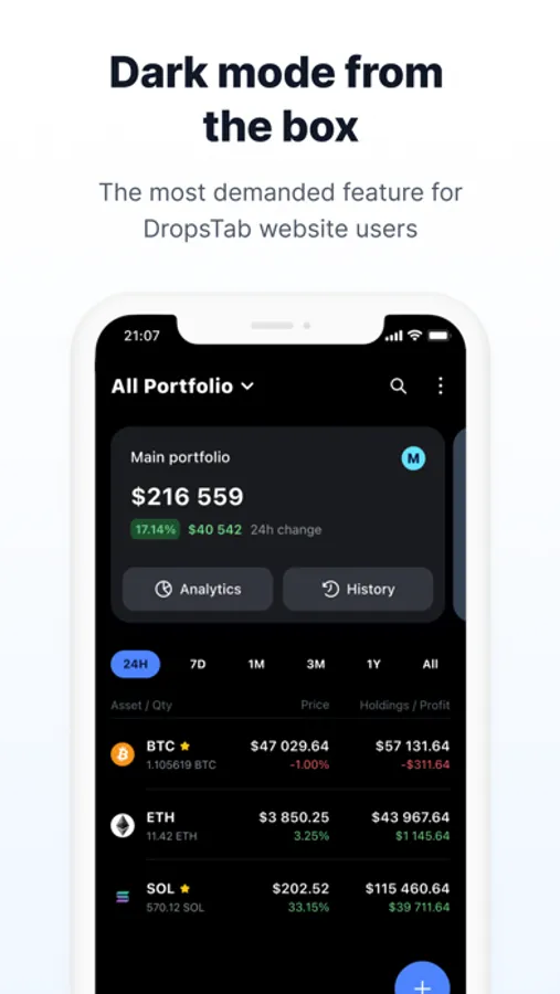 DropsTab is a cryptocurrency market tracker designed to facilitate your day-to-day crypto analytics, monitoring and portfolio management. Track prices, volumes and detailed performance of coins in your added portfolios.