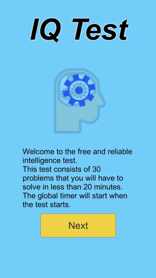 With this simple application, you will be able to know your level of intelligence and calculate your IQ easily and simply. You will only have to solve 30 problems in a maximum time of 20 minutes.