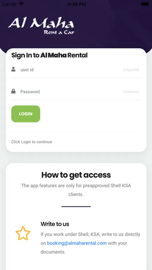 The app helps to coordinate bookings for Shell employees and track their requirements. Before using the app, please request for your User ID and password from Al Maha.