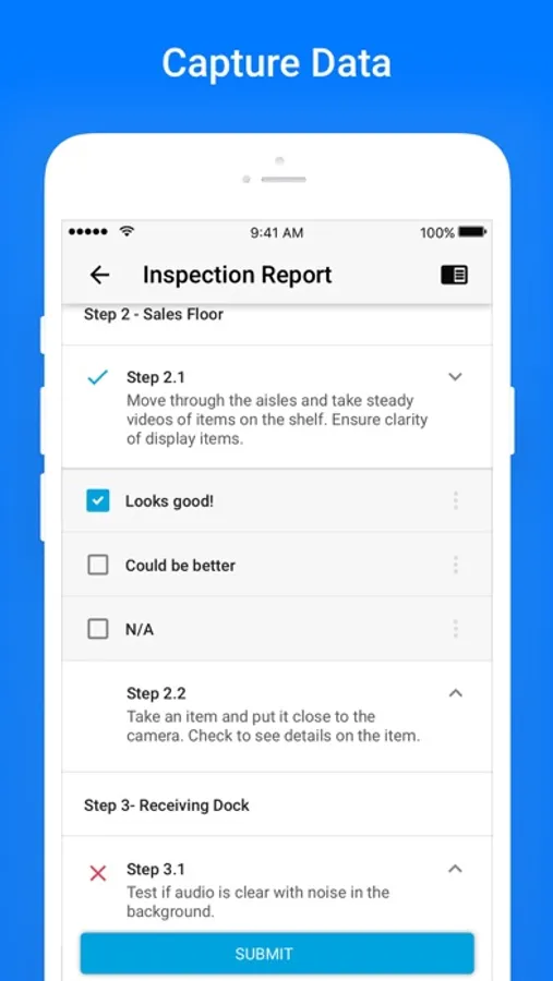 Capture Data & Media - Input text, answer questions, and capture photos or videos for documenting reports or inspections.