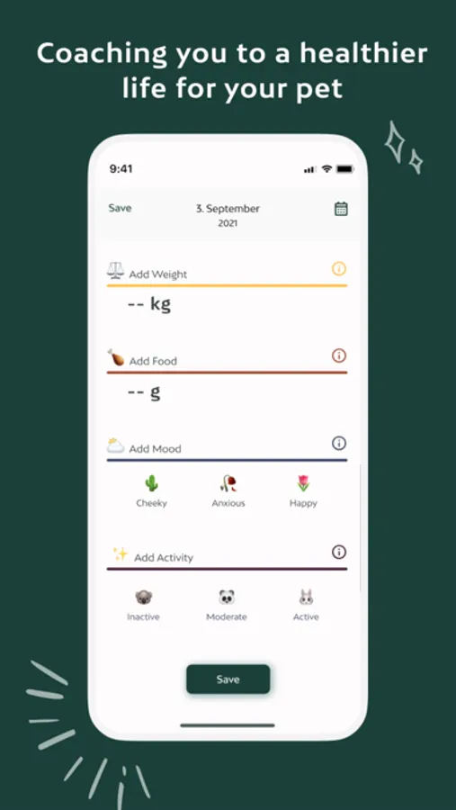 * Simplified tracking sheet: Tracking of weight, food intake, mood, and activity levels has never been easier. For food and weight tracking, you can enter a numerical value, and for mood and activity, you enter an emoji that represents what you predominantly perceived from your pet that day. Should you forget to track for that day, you can easily use our calendar to go backwards and enter information. All metrics are tracked on the same tracking sheet, and you have information boxes coaching you on the importance of each metric. Filling out the tracking sheet will not take more than a couple of minutes each day.