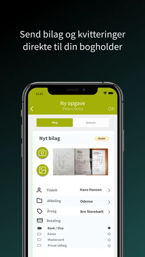 Kontor Fyn er din nemme løsning til at håndtere bilag. Du kan tage billeder af dine bilag eller fakturaer og sende dem direkte til din bogholder med mulighed for at vælge afdeling, projekt, årsag og betalingsmetode.