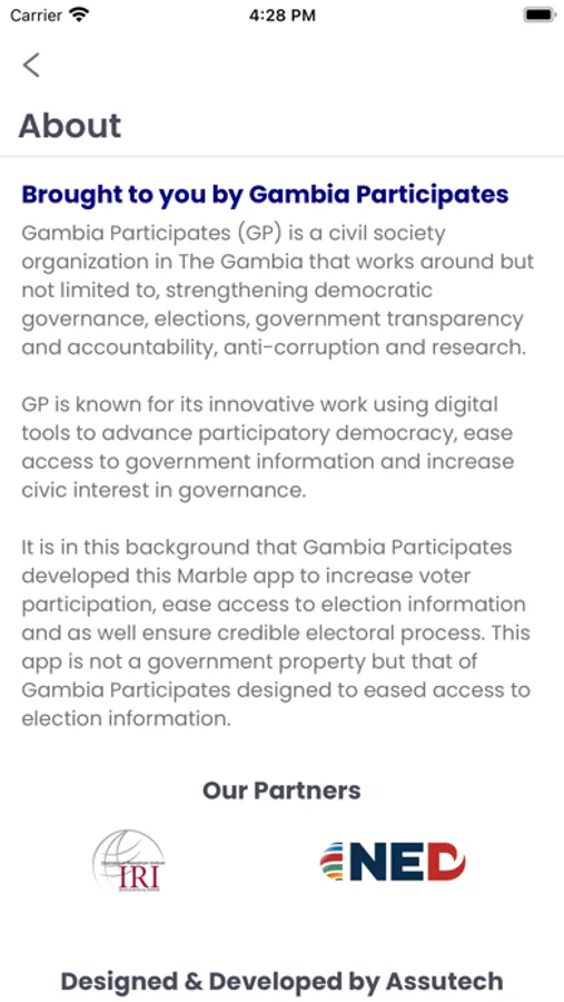 The main source of information on Marble is from The Gambia Independent Electoral Commission (IEC) website https://iec.gm/ where information on elections is publicly accessible. This app DOES NOT represent any government entity nor is it affiliated with a government or political party.