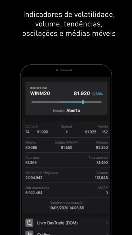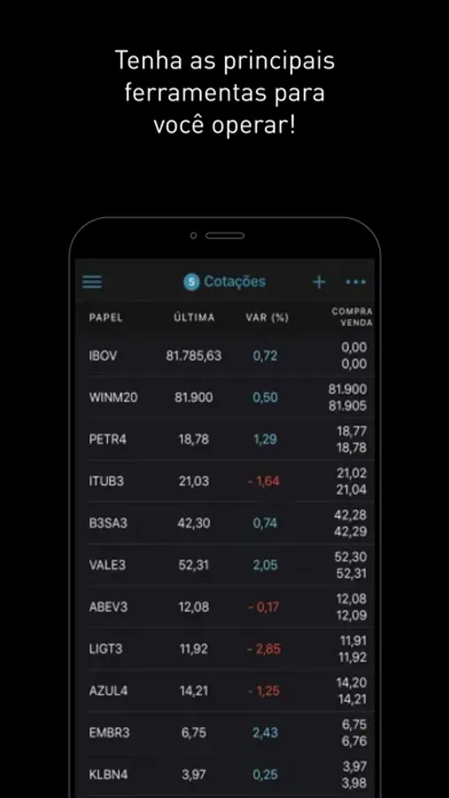 - Acompanhar o book de ofertas dos principais ativos em tempo real pelo smartphone.