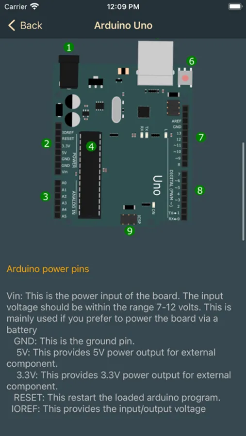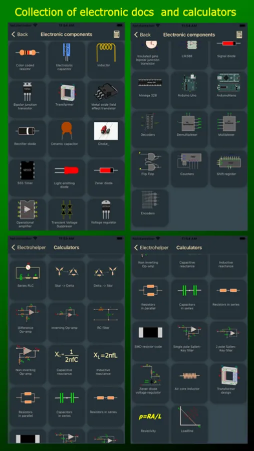 The app contains the electronic components reference section, electronic circuit reference section, and electronic circuit calculation section.