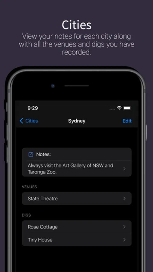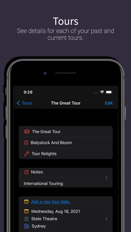 Track upcoming tour dates, upcoming and past venues, your favourite digs in different cities and which venues you've visited.