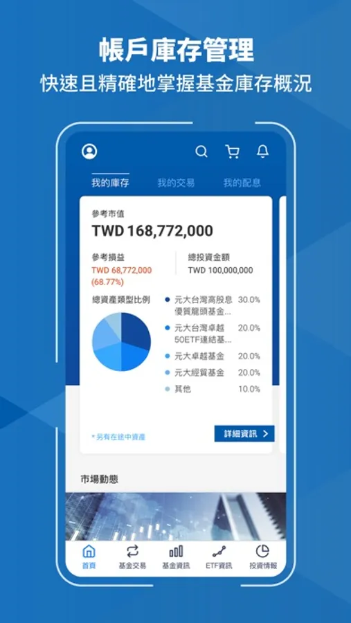 快速且精確地掌握基金庫存概況,完整檢視參考市值、參考損益、總投資金額以及手中各檔基金的持有單位數與投資報酬,做好庫存管理,就放心交給元大基金先生APP。