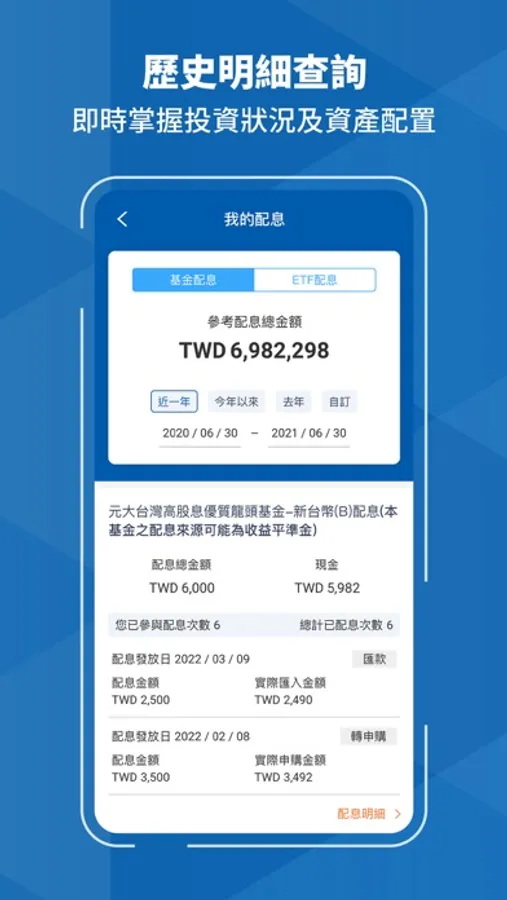 即時提供基金帳戶交易紀錄,清楚追蹤已完成、在途中等每一筆交易明細及交易目前狀態;此外,逐筆顯示您的配息明細一目瞭然,元大基金先生APP更獨家提供曾參與過元大ETF配息的投資人,直接在APP查詢過去參與元大ETF配息的相關紀錄,更有利於投資人掌握投資狀況及資產配置。