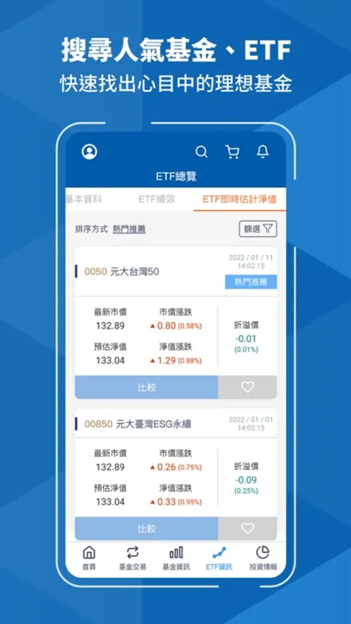 輸入關鍵字或選擇搜尋條件,快速找到想要的產品資訊。元大基金先生APP提供基金、ETF最新淨值、績效表現、持股比重、投資區域及產業配置等重要資訊;還可進行基金、ETF比較,快速找出您心目中的理想基金。