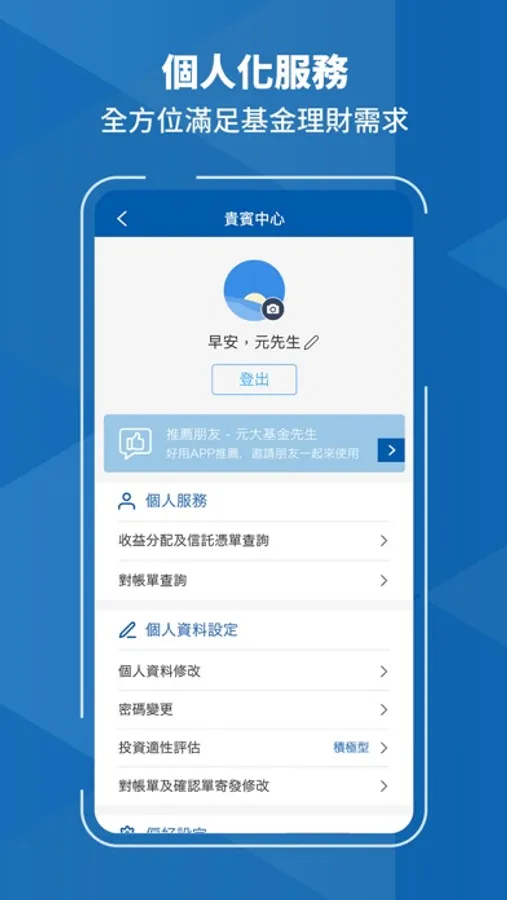 元大基金先生APP打造個人化服務,舉凡基本資料修改、基金對帳單寄發、交易成功回報及淨值到價通知等投資人在意的即時資訊推播,隨時關注基金動向;且上架市場趨勢研究報告及影音服務,提供熱門投資議題及精選投資標的,全方位滿足您在基金理財的各種需求。