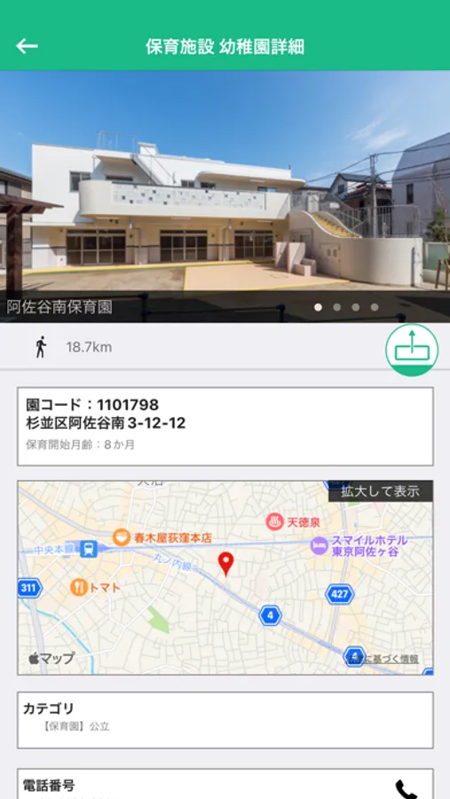 各施設の定員や受け入れ月齢、施設内外の写真など、詳細情報を確認することができます。