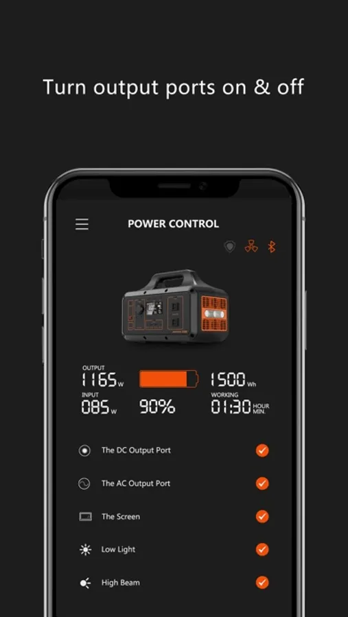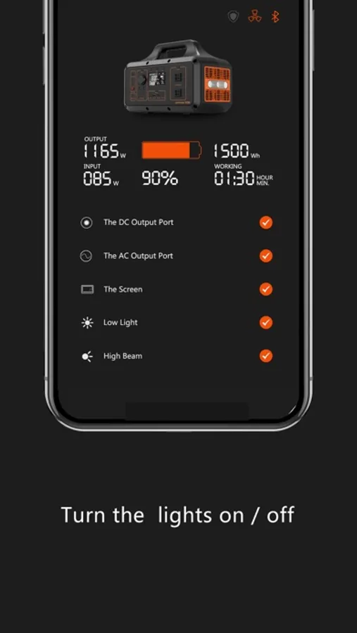 Jupitek Portable Power Station App, mobile phone controls outdoor mobile power input, output and lights, and monitors equipment status in real time.