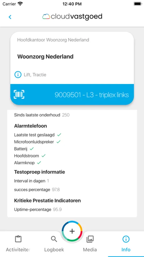 Met deze Cloud Vastgoed app controleert & beheert u real-time alle technische activiteiten rondom uw asset, asset onderhoud, asset reparaties, asset keuringen, asset renovaties worden allen inzichtelijk via de app vastgelegd en geanalyseerd. Dit resulteert in heldere key performance indicators waarmee u het overall serviceniveau van uw assets verbetert en tegelijkertijd de kosten van de assets vermindert.