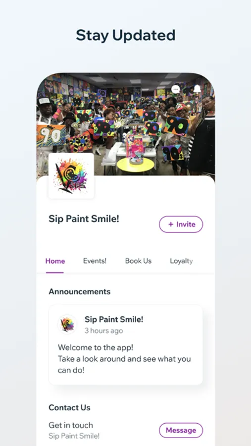 Welcome to the Sip Paint Smile mobile App! Join your friends and invite the others, Book a party, take a class, earn rewards, save on tickets all in one place! Get Exclusive access to special events and more!