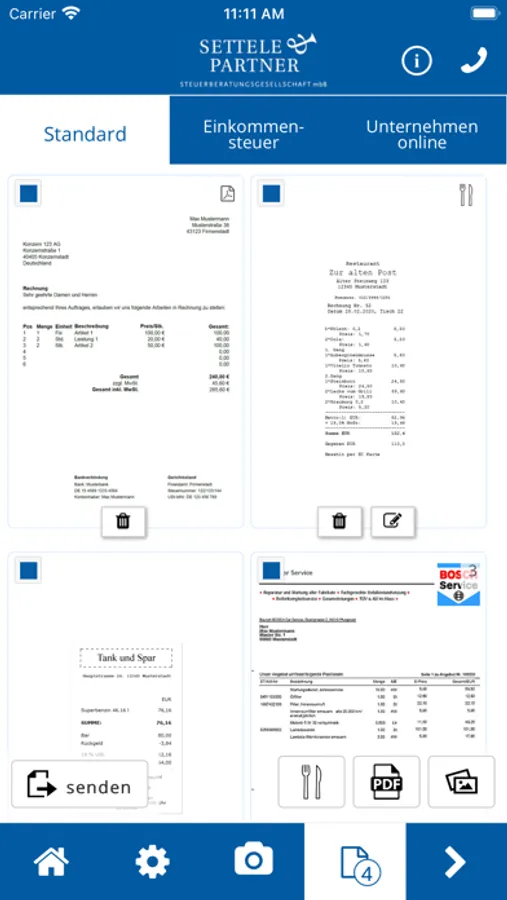 Erstellen Sie einfach ein oder mehrere Fotos Ihrer Belege bzw. Dokumente und versenden Sie diese anschließend mit einem Klick direkt aus der App heraus an Settele & Partner