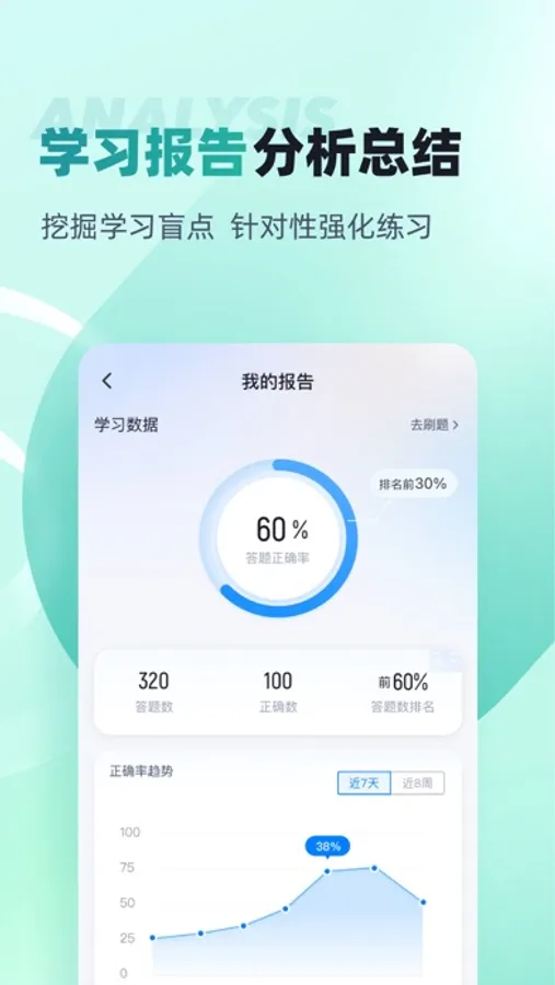 养老护理员题库内含考点练习,全国通用卷以及地区卷模拟练习,以及按照固定考试比重的随机式的抽题的真题考场,成绩单实时记录考试数据,一点一滴的反馈考生近期学习状态以及自我正确率的提升,大大的给予考生通过考试的信心。