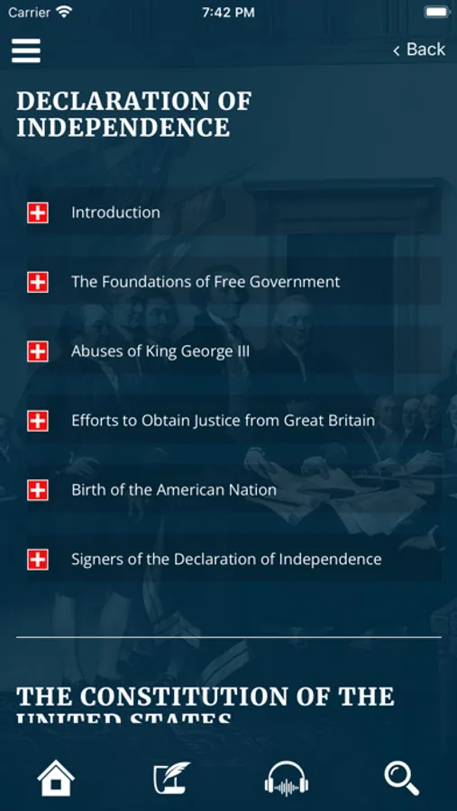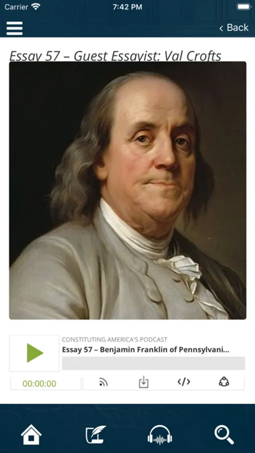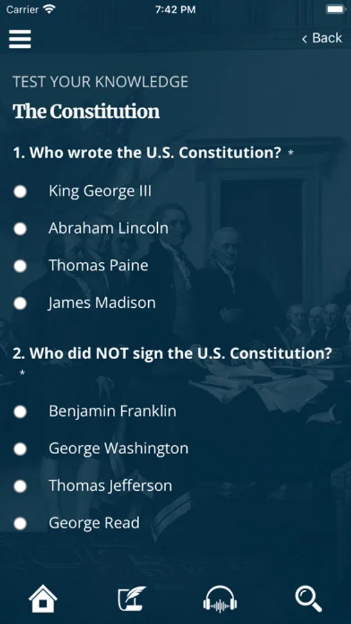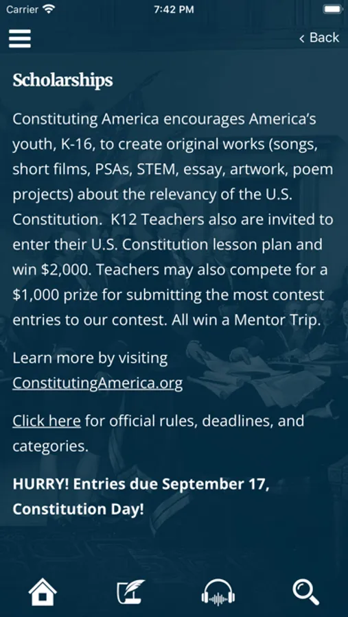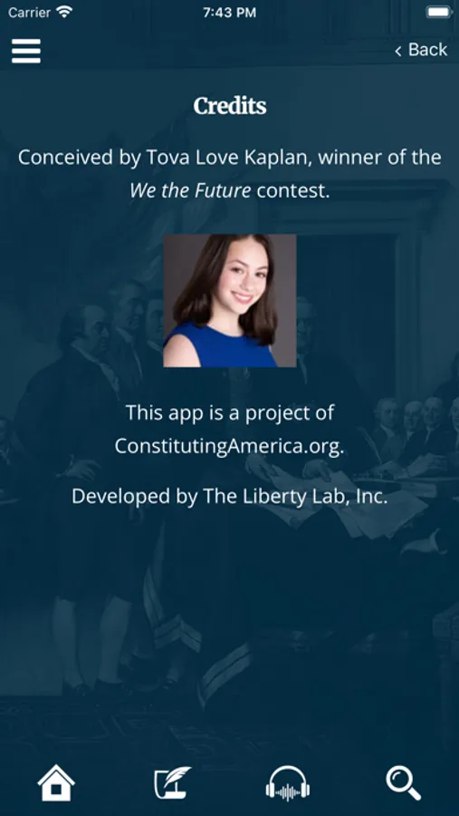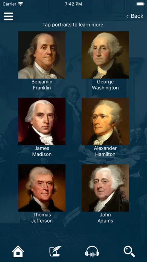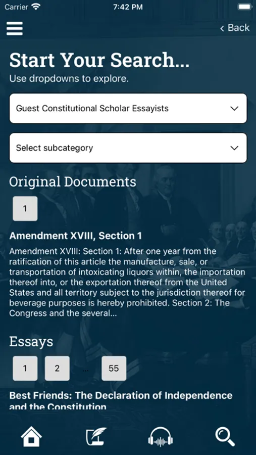 An educational tool featuring comprehensive search functionality on the U.S. Constitution, the Declaration of Independence, the Federalist Papers, and academic essays and biographies about the Founding Fathers of the United States.