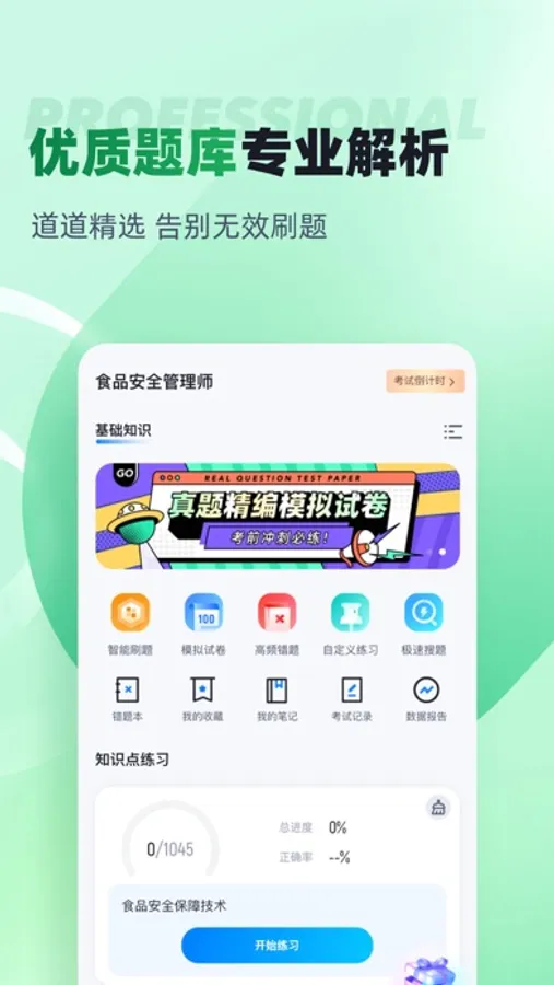 食品安全管理师题库内含考点练习,全国通用卷以及地区卷模拟练习,以及按照固定考试比重的随机式的抽题的真题考场,成绩单实时记录考试数据,一点一滴的反馈考生近期学习状态以及自我正确率的提升,大大的给予考生通过考试的信心。