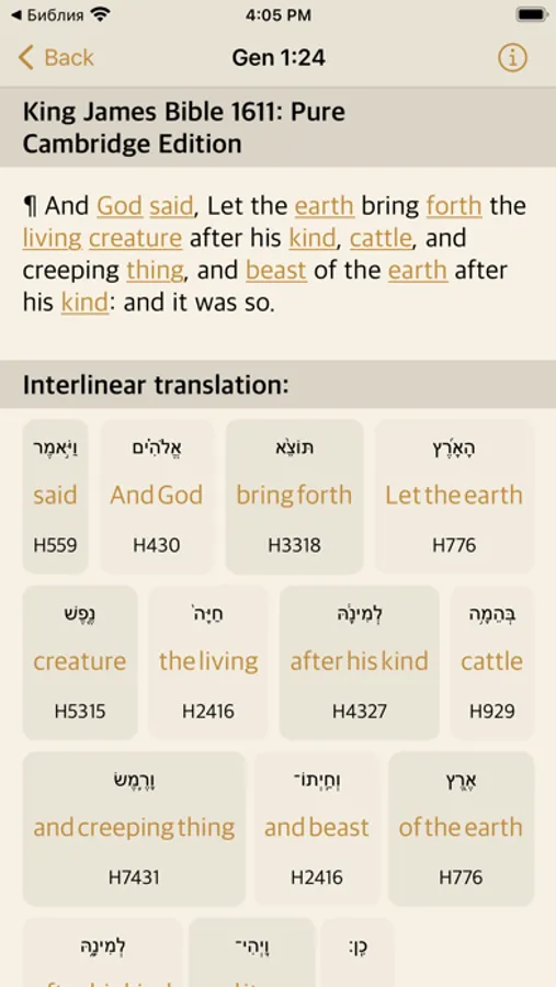 . For a deeper study of the Bible, there is a convenient mode - Working with Strong's numbers. It allows you to study the original Greek / Hebrew text and compare it with the translation.