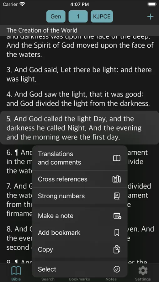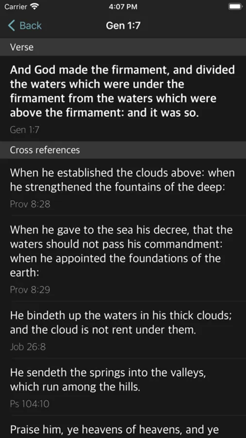 . Cross references to each verse. To view a parallel place, you need to make a long press on the verse and select "Parallel Places". A screen with all parallel locations will open (Locations taken from "The Treasury of Scripture Knowledge")