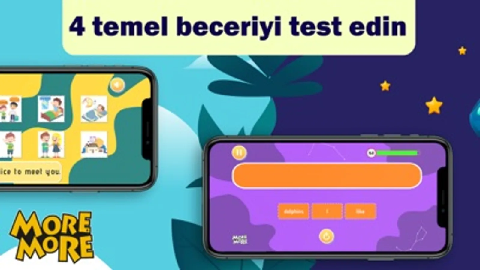 More & More 3. Sınıf Dijital Eğitim Platformu yıl boyunca çocuğunuzun elinizden düşmeyecek bir uygulama olacak. Yıl içerisinde yapılacak güncellemelerle birlikte sektördeki en kapsamlı uygulamaya şimdiden sahip olun. 100 oyuns sahip uygulamamız ile sıkılmadan bol tekrar yapma fırsatına sahip olacaksınız. Milli eğitim müfredatına tamamen uygun bu uygulama ile çocuğunuz İngilizceyi eğlenerek öğrenecek. Her yıl uygulamaya eklenecek sürprizlere hazır olun. İngilizce eğitiminde geliştirdiğimiz dijital oyun temelli yöntem ile çocuğunuz 4 beceriye (okuma, yazma, dinleme ve konuşma) göre kendini test edebilecek.