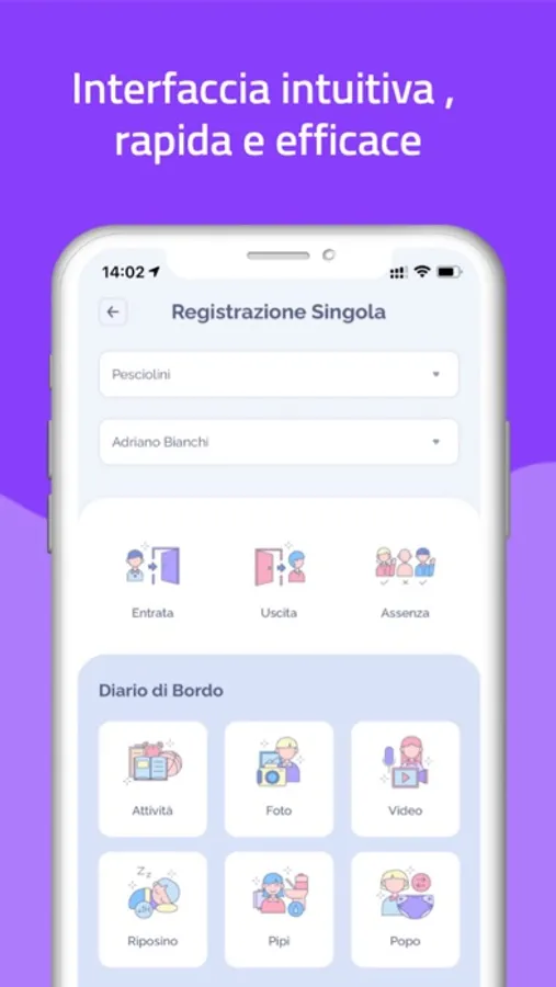 - Gestione diario di bordo (presenze, assenze, attività, pranzo, merende, riposini, bisognini)