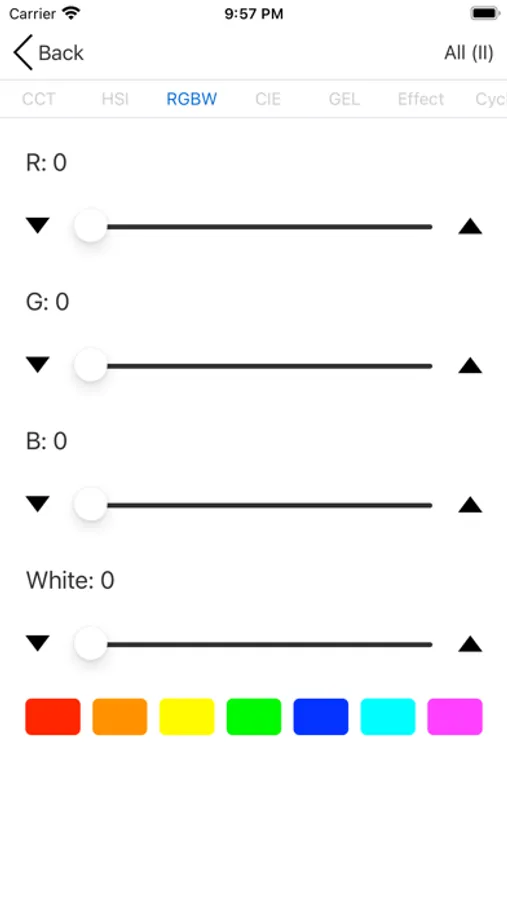 * Full-spectrum RGB can be controlled via RGB color picker, HSI sliders, CIE coordinates, or color gel presets.