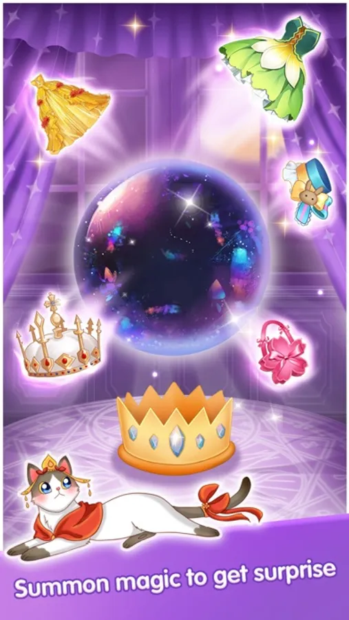 - merge and collect cats in the kucing room, merge cats to summon princess dresses