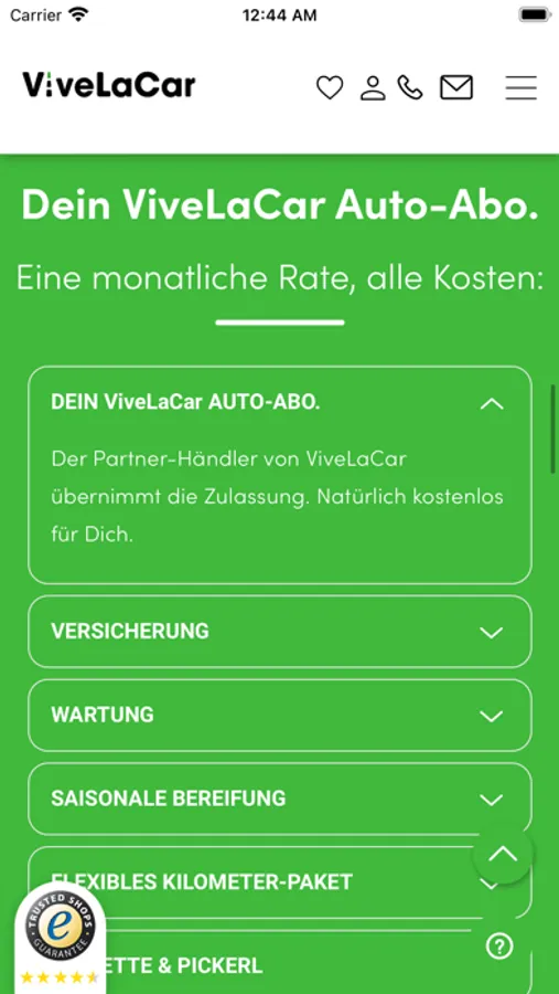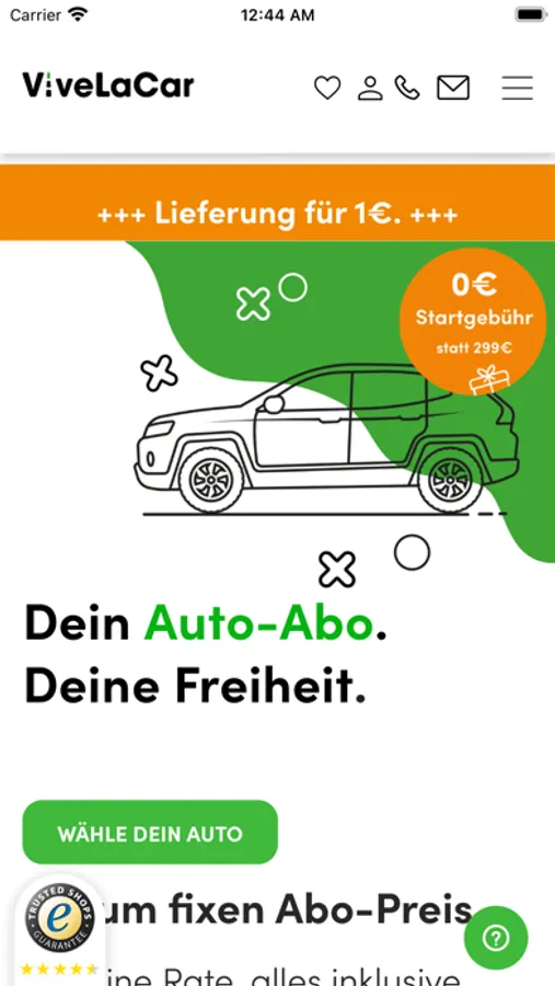 Jetzt die APP runterladen und das Auto in Zukunft abonnieren statt kaufen – alle Kosten sind im monatlichen Abo-Preis schon enthalten (außer Tanken)