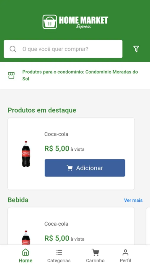 Com nosso aplicativo você pode adicionar produtos ao carrinho, fazer sua compra e retirar no condomínio.