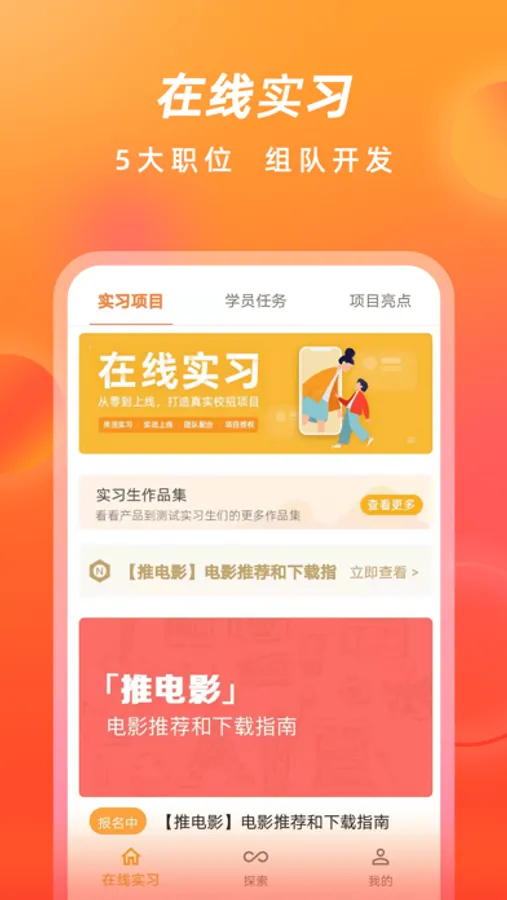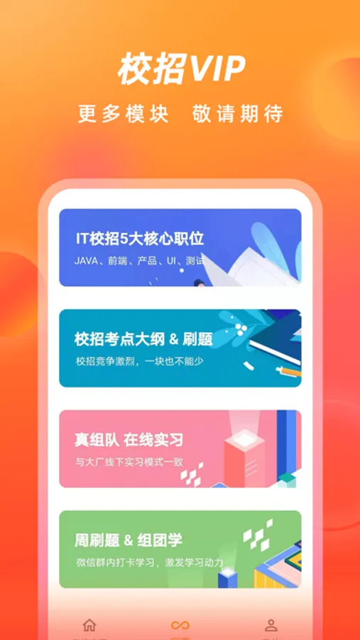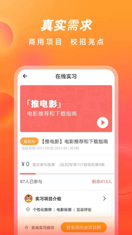 校招VIP是主打在线实习的应用,精心挑选面向青年人群体有真实商业需求的项目,采用与互联网大厂实习一致的流程:产品、UI、前端、JAVA和测试组队配合,迭代上线。